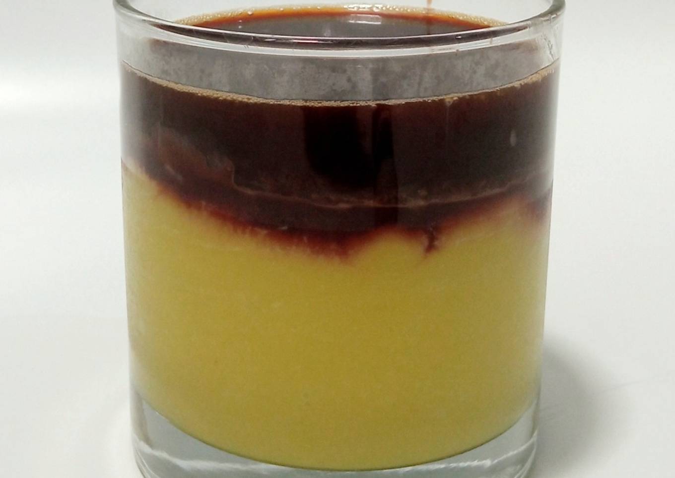 - Ambil gelas, tuang jus alpukat. Beri kental manis secukupnya. Tuang kopi.