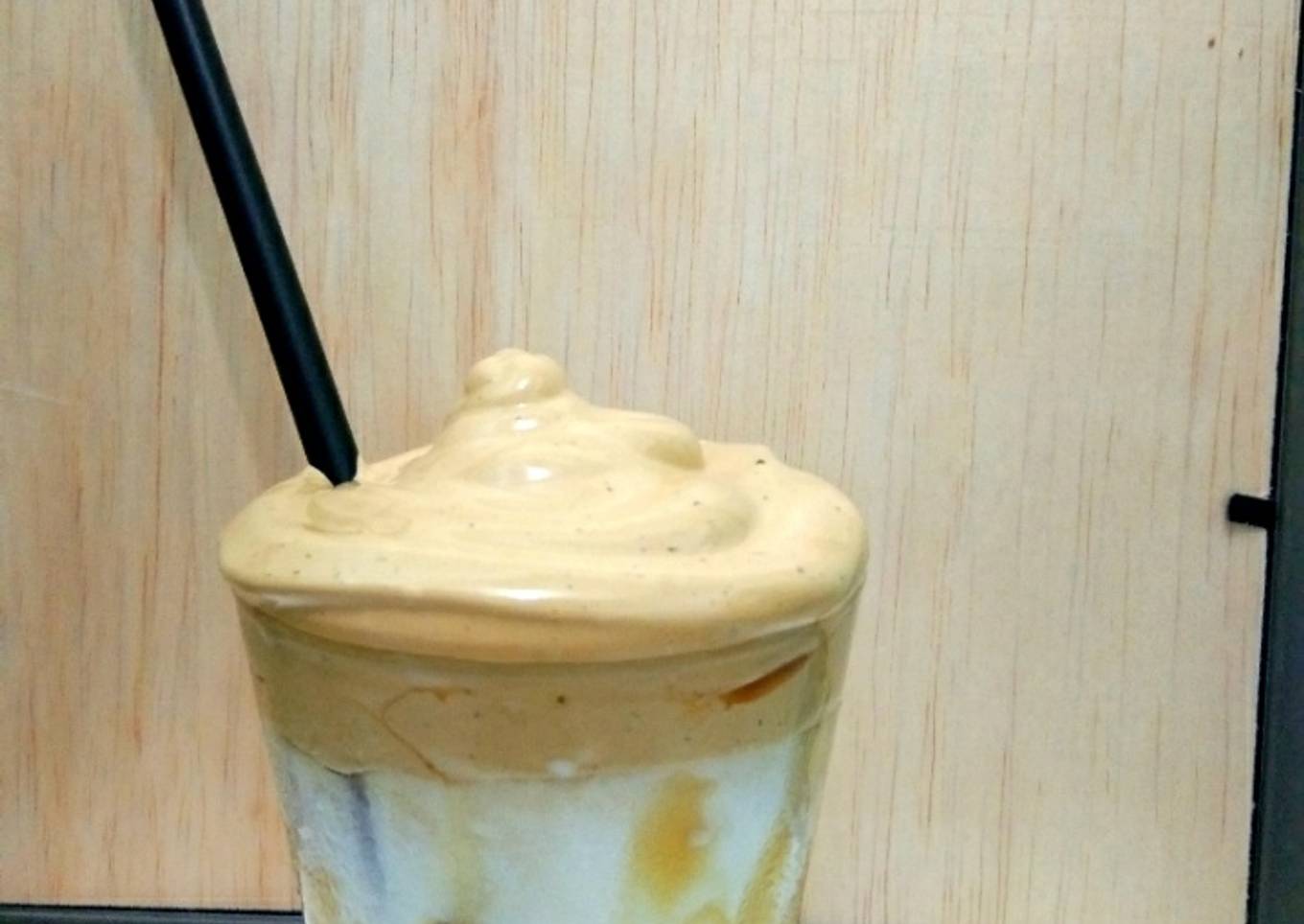 - Terakhir tambahkan susu dan cream kopi. Dalgona coffee caramel siap disajikan ๐