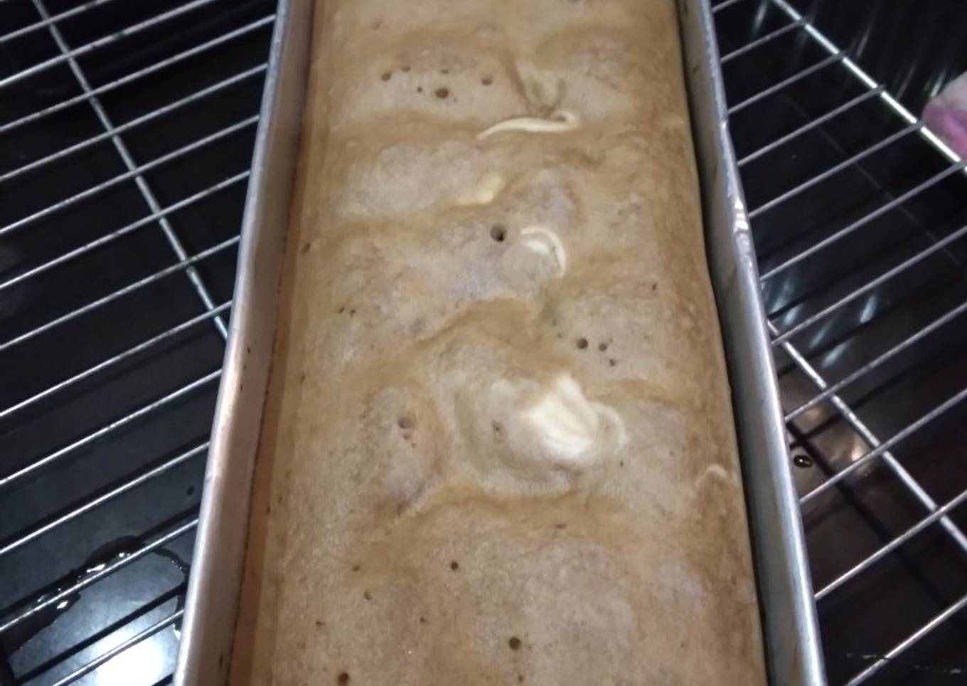 - Tuang dalam loyang 24 × 10 yang sebelumnya sudah dioles margarin & dialas kertas roti. Hentakan agar rata & tidak ada gelembung.